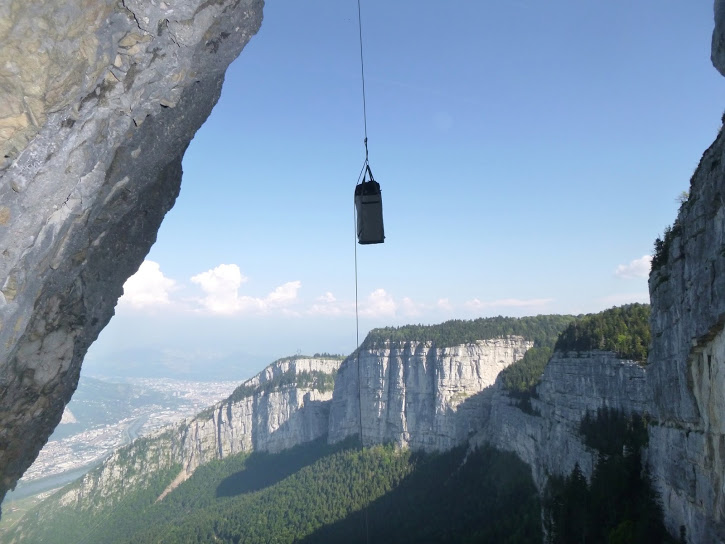 Plein de bout de cordes pendent de cette falaise, et pas que dans des lignes vierges: le début de la voie de la Chouette est aussi staté, et les cordes ne sont pas neuves. Si les équipeurs-pollueurs du coin pouvaient entretenir leur jardin plutôt que de saccager des lignes majeures d’artif en VI/A3, nous nous étions fait la même réflexion l’année dernière à la Roche St Michel qui était un peu dans le même état.